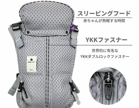 ファスナーを開けるだけで赤ちゃんをスッと抱っこできる、前開きタイプ。