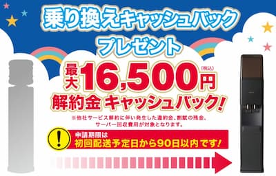 プレミアムウォーターに乗り換えると、他社ウォーターサーバー解約時に発生する費用を最大16,500円までキャッシュバックしてもらえます。